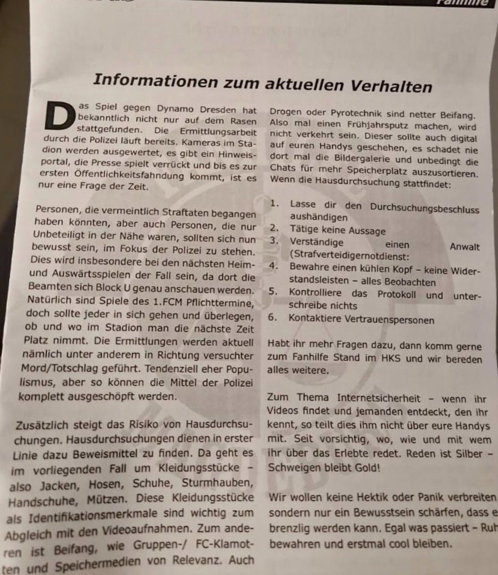 Der Flyer zementiert eine „Mauer des Schweigens“, die darauf abzielt, die Identifizierung von Tätern durch Videoaufnahmen unmöglich zu machen. Dass sogar dazu aufgerufen wird, Chatverläufe zu löschen und Zeugen innerhalb der eigenen Reihen mundtot zu machen („Schweigen bleibt Gold“), zeigt das tiefgreifende Problem einer Parallelgesellschaft in Teilen der Ultra-Szene.