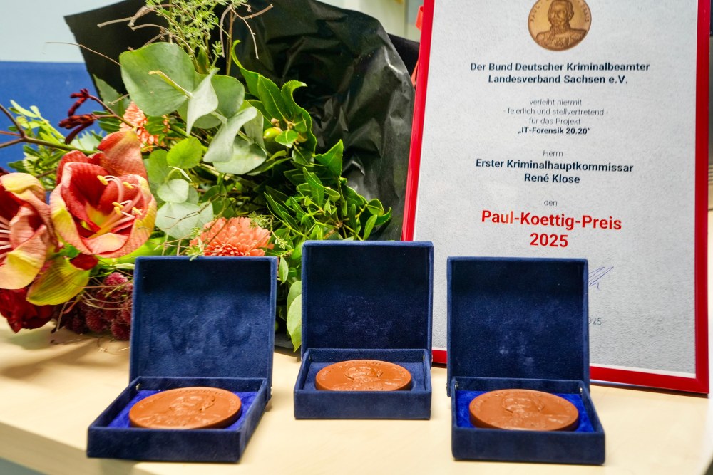 Bereits am 14. November 2025 fand die Verleihung des Paul-Koettig-Preises in der Bergwirtschaft Wilder Mann in Dresden statt. Mit dieser Auszeichnung ehrt der BDK Sachsen herausragende Beiträge, die kriminalistische Arbeit entscheidend voranbringen. In diesem Jahr wurde das Projekt „IT-Forensik.2020“ ausgezeichnet.