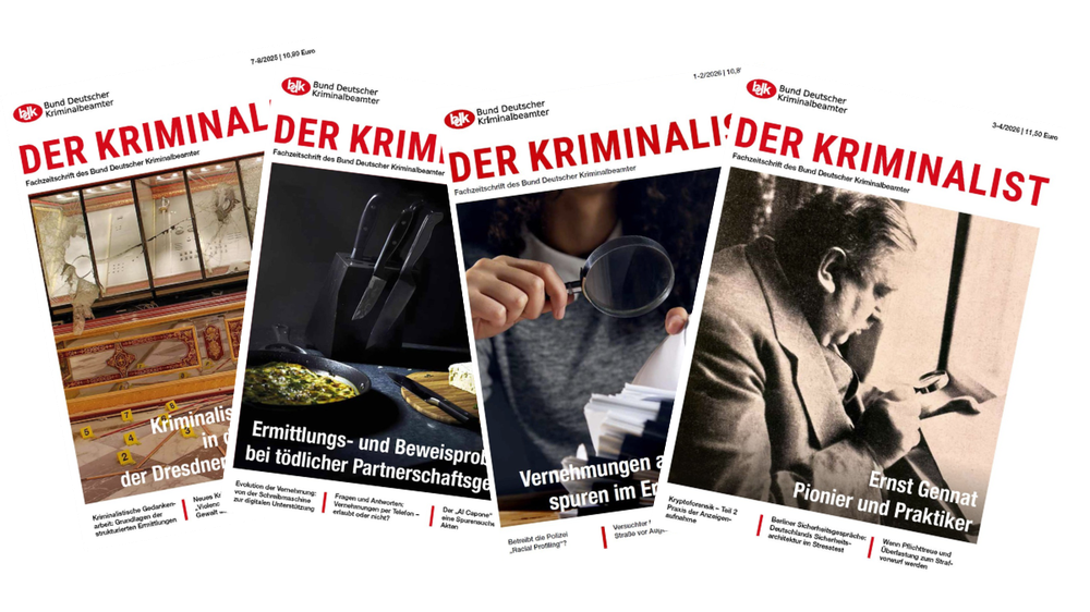 Unsere Verbandszeitschrift DER KRIMINALIST ist die auflagenstärkste Fachzeitschrift für die Kriminalpolizei und die Kriminalitätsbekämpfung in Deutschland. In sechs Ausgaben pro Jahr werden neben Entscheidungsträgerinnen und Entscheidungsträgern der Innen- und Justizpolitik, Journalisten und Medienvertreter insbesondere unsere Mitglieder über kriminalfachliche, kriminalpolitische und rechtliche Themen sowie über gewerkschaftspolitischen Aktivitäten in unseren 18 Bundes- und Landesverbänden informiert.
