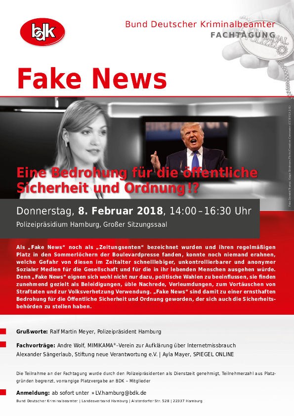 Am Nachmittag des 8. Februar 2018 veranstaltete der Bund Deutscher Kriminalbeamter, Landesverband Hamburg, im Polizeipräsidium eine Fachtagung mit dem Titel: „Fake News - eine Bedrohung für die öffentliche Sicherheit und Ordnung!?“