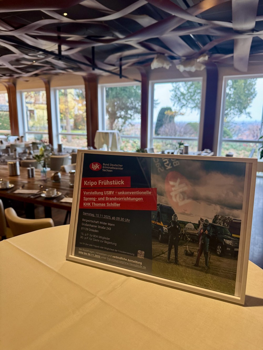 Vorstellung und Arbeit im Bereich USBV – unkonventionelle Spreng- und Brandvorrichtungen. Erfolgreiche Fortsetzung des „Kripo Frühstück“ des BDK Sachsen am 15. November 2025 in der Bergwirtschaft Wilder Mann in Dresden.