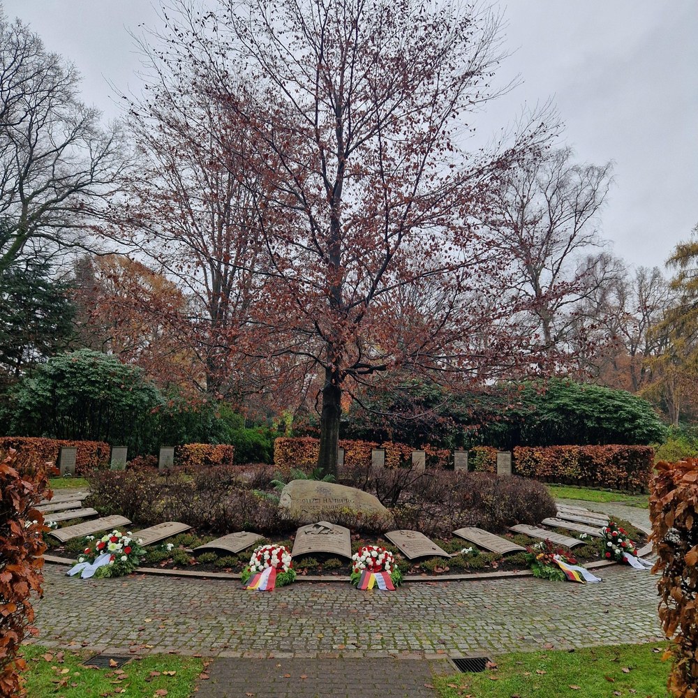 Auch an diesem Volkstrauertag, dem 16.11.2025, gedachten Vertreter der Behördenleitung, Polizeiführung und viele Kolleginnen und Kollegen aus dem Vollzug im „Revier Blutbuche“ der im Dienst ums Leben gekommenen Polizeibeamten der Polizei Hamburg auf dem Friedhof Ohlsdorf. Bis heute fanden 66 Polizisten im „Revier Blutbuche“ ihre letzte Ruhestätte.