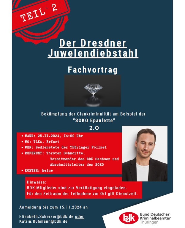 Nach der großen Resonanz auf die erste Veranstaltung zum Thema "Der Dresdner Juwelendiebstahl" im vergangenen Jahr und nach Abschluss des Verfahrens lädt der BDK alle Kolleginnen und Kollegen sehr herzlich zum Teil 2 des Fachvortrages über die Arbeit der „SOKO Epaulette“ am Montag, den 25.11.2024 von 14.00 – 18.00 Uhr in die Mensa des TLKA, ein.